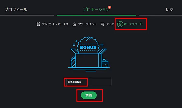 サイト上部のプレゼントアイコンをクリックし、「ボーナスコード」タブを選択します。入力欄に「BMJBONS」を入力して「承認」をクリックします。