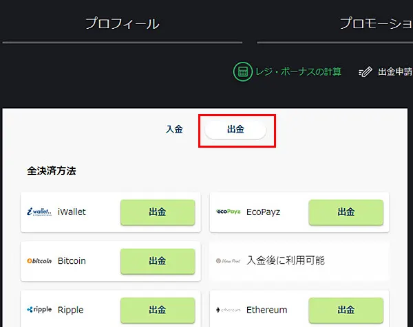レジ画面が開いたら「出金」タブを選択します。利用可能な出金方法が一覧で表示されます。