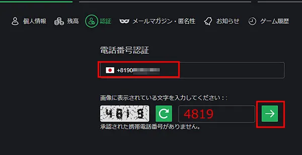 電話番号を「81+先頭の0を除いた番号」で入力します(例:090-1234-5678 → 819012345678)。画像認証の4桁を入力し、SMSで届いた確認コードを入力して認証を完了させます。