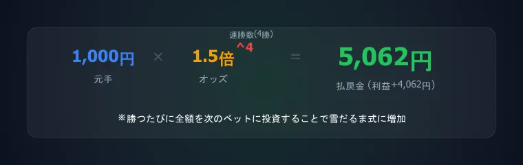 例:1,000円 × 1.5^4 = 5,062円(4連勝時)