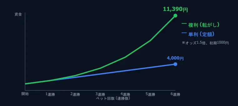 1,000円をオッズ1.5倍に賭け続けた場合、転がし(複利)と単利(毎回1,000円固定)ではどれだけ差がつくかを比較します。