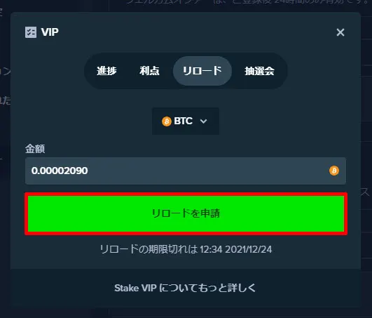 VIPページ内の「リロード」タブを開き、「リロードを申請」ボタンをクリックします。申請が完了すると、BTCウォレットに$1相当の無料チップが付与されます。翌日以降も同じ手順で毎日申請してください。