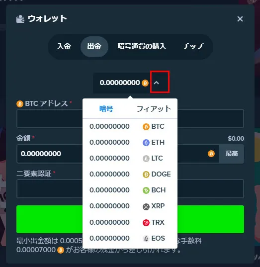 画面上部の「ウォレット」をクリックし、「出金」タブを選択します。出金したい仮想通貨を選んでください。