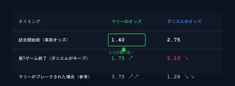 マリーが事前1.40 → ダニエルのキープ後に1.75まで上昇。この1.75のタイミングでベットすることで、 事前にベットするよりも有利なオッズを得られます。マリーが実力通りに勝てば、より高い配当を受け取れる仕組みです。