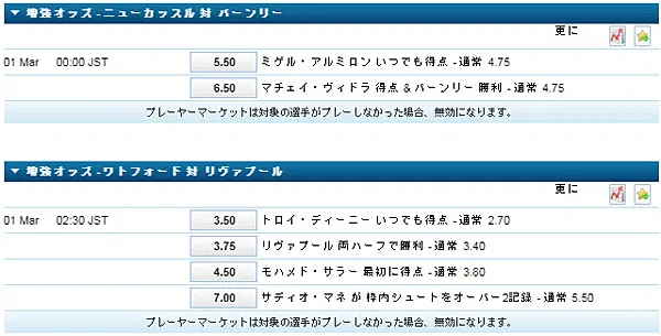 特定の注目試合で通常よりも大幅に高いオッズが提供されるプロモーションです。 プレミアリーグやチャンピオンズリーグなどのビッグマッチで頻繁に開催されます。