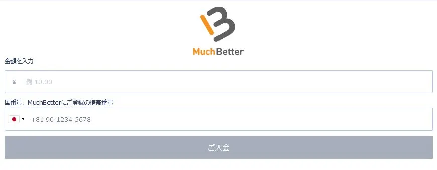 入金したい金額(最低1,500円)とMuchBetterに登録した携帯番号を入力します。携帯番号は先頭に国番号(+81)が必要です。
