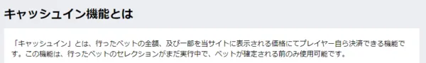 試合終了前にベットを決済できる機能で、勝ち逃げや損切りが可能です。利益確定や損失の最小化に活用でき、柔軟な賭け管理ができると好評です。