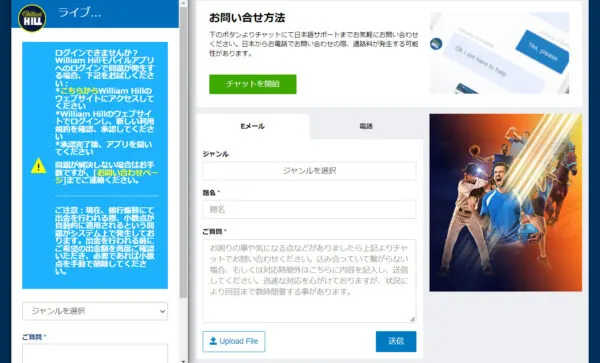 ライブチャット(08:00〜深夜01:00)とメール(24時間対応:support.ja@willhill.com)の2種類のサポートがあり、日本語で問い合わせが可能です。