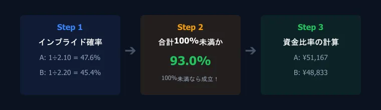 オッズ差が条件を満たせば、どの結果でも利益が確定する。運に依存しない唯一の手法。