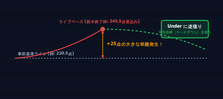 バスケは「平均回帰」が起きやすいスポーツです。前半に得点が爆発しても、後半はペースダウンする傾向があります。 逆に、前半に得点が少なくても、後半は巻き返す展開になりやすい。この「平均への回帰」を利用して、 ラインが大きく動いたタイミングで逆方向にベットするのがこの投資法のコアです。