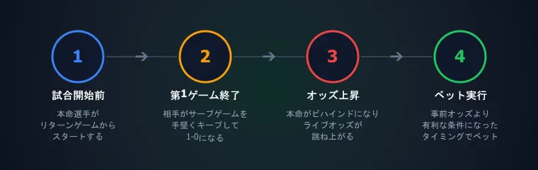 本命選手がリターンから → 最初のゲームを落とす可能性が高い → オッズが上昇 → 事前オッズより有利な条件でベット