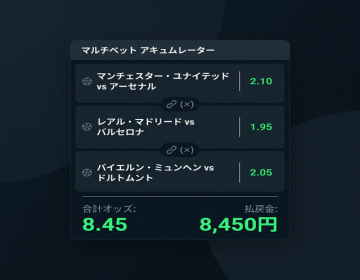 複数の試合の予想を組み合わせて1つのベットにする賭け方。すべて的中すればオッズが掛け算で跳ね上がりますが、1つでも外れると全額没収。