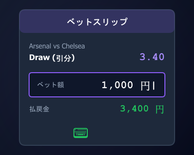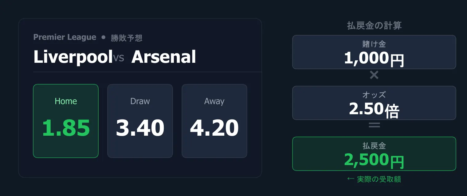 たとえばオッズ2.50の試合に1,000円を賭けて当たれば、2,500円が戻ってきます(利益1,500円)。計算式は賭け金 × オッズ = 払戻金、これだけです。