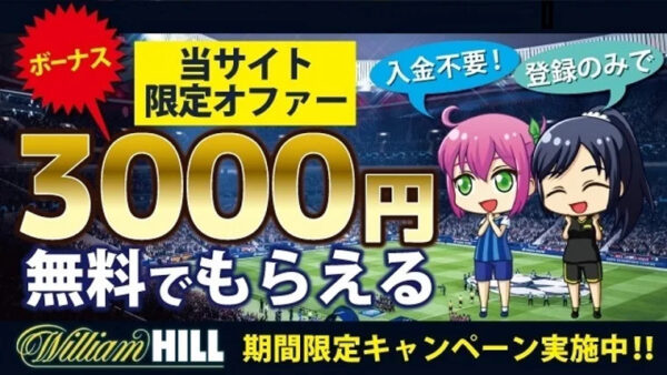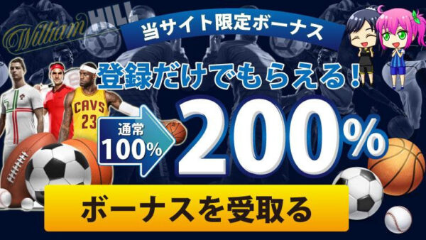 ウィリアムヒル(William Hill)は1934年創業の老舗ブックメーカーで、日本語対応の充実したボーナス・プロモーションを提供しています。 当サイト限定のプロモコード「J200」を使えば、入金不要3,000円ボーナスと初回入金200%フリーベットを受け取れます。