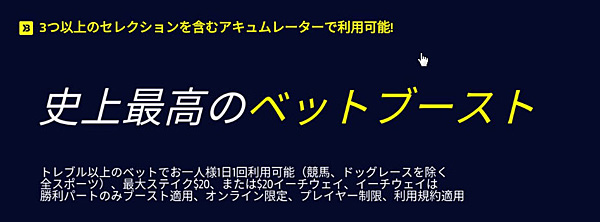 - アキュムレーターブースト・最終オッズ保証などの常設プロモ