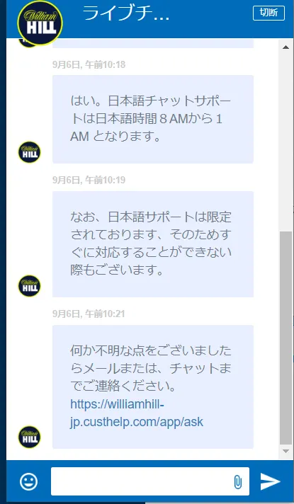 ライブチャット(08:00〜深夜01:00)とメール(24時間対応:support.ja@willhill.com)の2種類のサポートがあり、日本語で問い合わせが可能です。